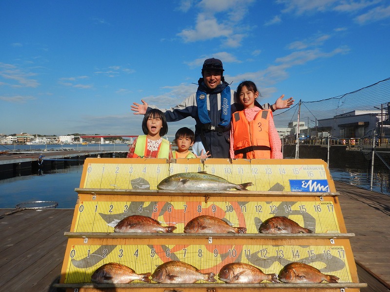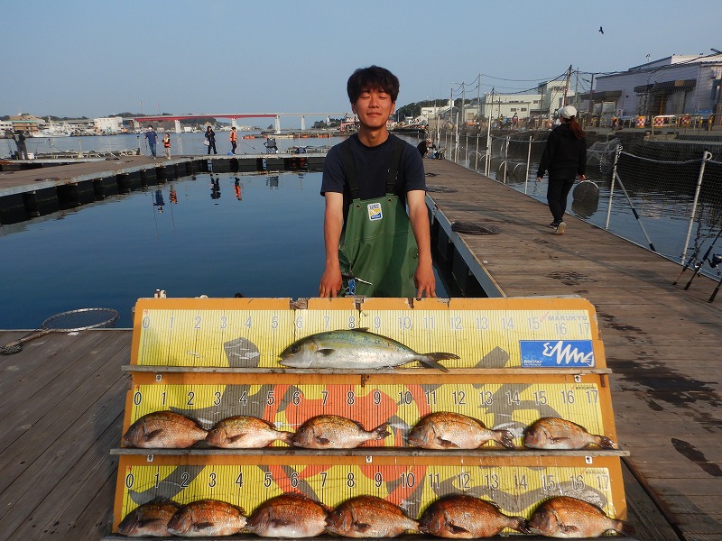 本日は午前中は曇り空が広がり雨もパラパラ降る時間も ありましたが、午後は晴れていい天気になりました! 朝の水温は14.7℃、透明度は2メートル程です。 それでは本日の釣果を紹介します! リピーターO様 大ダイ×3 マダイ×10 スタートから活性が高くコンスタントに釣れてましたね! 餌は全部黄色の練り餌で釣れたそうです! おめでとうございます!! 初来店T様ファミリー カンパチ×1 マダイ×7 カン