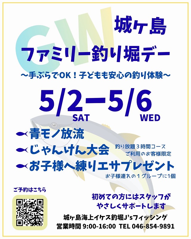5月2日~5月6日のイベント内容になります! ①青物放流 午前も午後もショゴを放流します! ②じゃん